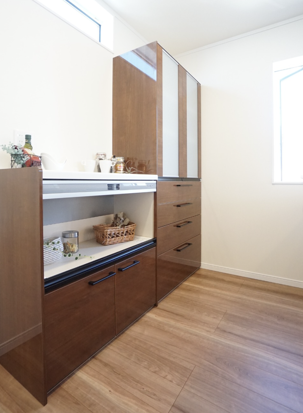 食器棚は、中段に“見せる棚”を設け、雑貨や乾物、飾り小物をディスプレイできるように。