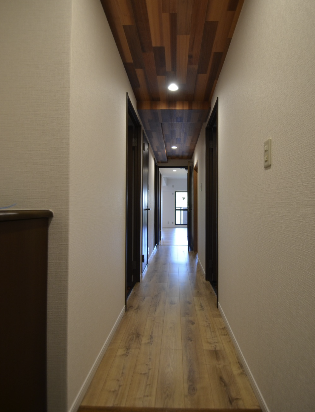 天井材に変化を加えることで、空間に視線の流れが生まれ、ただの直線廊下が「印象的な通り道」に変身。